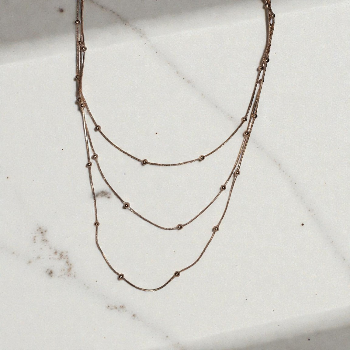 Collier à trois rang Gold en acier inoxydable chaîne dorées, délicatement ponctuée de petites perles métallique. Léger et élégant, il crée un joli effet de superposition qui habille le décolleté avec subtilité et modernité.
